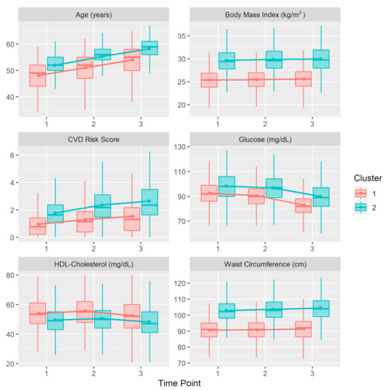 Box plots depicting mean values (dots) for each variable per cluster. Lines represent the evolution of the mean for each cluster over the three time points analyzed. Abbreviation: CVD, cardiovascular disease.