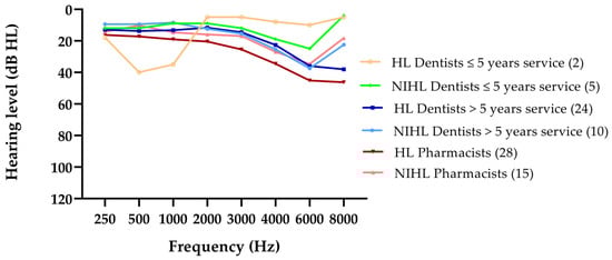 Of the group of dentists with >5 years service, two ears (one person) were excluded from further testing due to bilateral hearing aids (Table 1). In total, 33/104 ears of dentists with >5 years service, 40/106 ears of pharmacists, and 13/94 ears of dentists with ≤5 years service failed the hearing screening unilaterally or bilaterally. After otoscopy and PTA, 21 ears appeared to have normal hearing, i.e., hearing thresholds below or at 20 dB HL between 250 and 8000 Hz (eight ears of dentists with >5 years service, six ears of pharmacists, and seven ears of dentists with ≤5 years service). Since PTA was done bilaterally, 19 ears that had initially passed hearing screening presented an HL in one or more frequencies (nine ears, nine ears, and one ear for dentists with >5 years service, pharmacists, and dentists with ≤5 years service, respectively). Subsequently, a decline in hearing at one or more frequencies was established in 34/104 ears of dentists with >5 years service, 43/106 ears of pharmacists, and 7/94 ears of dentists with ≤5 years service.