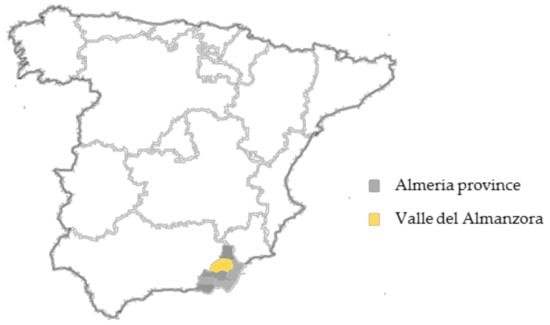 The study area was the Valle del Almanzora (Almanzora Valley), province of Almería (Southeastern Spain), where the majority of companies dedicated to the creation of artificial stone products are located (Figure 1). Almanzora Valley is characterized by having an over three-thousand-year-old marble industry that has nurtured world heritage by supplying white marble to numerous historical monuments.