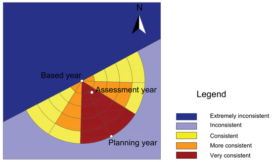 Thirty-two vector components can be obtained by setting the construction land central gravity coordinates in 2009 as the center of a circle and the offset distance from 2009 to 2020 as the radius, which is divided into five equal parts, and dividing the sector at an angle of 30°. At any point in those areas, the longer the distance of the center of gravity movement, the longer the implementation time of the planning. The smaller the deviation angle between the trajectories of the center of gravity movement and the planning offset, the more consistent is the direction of the planning (Figure 2).