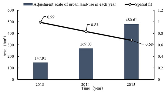 The spatial coincidence degree between the planning adjustment data and land-use change data in Rongchang District in 2013 was as high as 0.99. The spatial coincidence degree decreased year by year, dropping to 0.83 in 2014 and as low as 0.68 in 2015, which indicates that the land-use change and the planning adjustment were highly consistent when the first adjustment was made two years after the implementation of the plan in 2013. On the one hand, planning should not be adjusted year after year. On the other hand, from the data shown in Figure 7, the degree of coincidence of the planning adjustment continually declines with the passage of time, and it is ideal for the degree to reach 0.99 after the implementation of planning two years later.