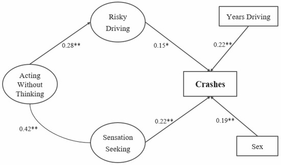 Table 4 provides the correlation coefficients between crashes and the individual characteristics and dangerous driving practices, as well as the factor score described above. As expected, age, sex, and number of years licensed were associated with crashes. Not surprisingly, age and number of years licensed were also highly correlated (r = 0.7). Sensation seeking and the risky driving factor were also positively correlated with crashes, while acting-without-thinking was only correlated with risky driving (along with the number of years licensed and sensation seeking). Delay discounting was not associated with crashes or risky driving. Of note, although the correlations between the individual risky driving survey items and crashes presented above in Table 1 were sometimes low (however significant at the p < 0.01 level), the combined risky driving factor was also significantly associated with crashes. A structural equation model was tested that regressed the binary prior crash variable on the risky driving factor, sensation seeking, and acting-without-thinking, while controlling for sex and number of years licensed. The model (Crash Model 1) fit the data well (CFI = 0.92; TLI = 0.91; and RMSEA = 0.04 [90% CI, 0.03–0.05]). Crashes were significantly associated with risky driving (b = 0.16, SE = 0.07, p = 0.036 [95% CI: 0.019, 0.306]) and sensation seeking (b = 0.48, SE = 0.16, p = 0.004 [95% CI: 0.177, 0.837]), but not acting-without-thinking (b = −0.09, SE = 0.26, p = 0.740).