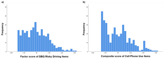 Frequency distribution of responses on (a) risky driving items, and (b) cell phone use items.