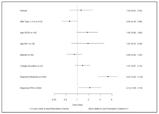 In multivariate analysis, a diagnosis of melasma was independently associated with the greater use of prescription lightening creams (OR 6.27; 95% CI: 3.44,11.43; p < 0.001), as was PIH (OR 2.12; 95% CI: 1.08, 4.14; p = 0.029). In addition, there were lower odds of lightening agent use among those with lighter skin types (OR 0.62; 95% CI: 0.39, 0.98; p = 0.042).
