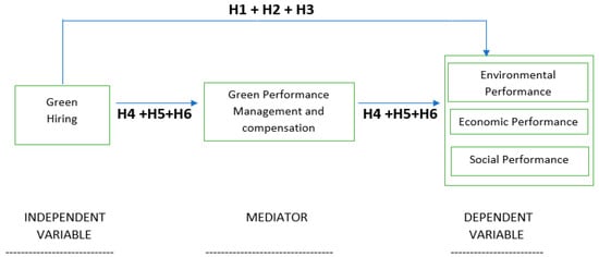 Green performance management and compensation have significant importance as employees are punished and rewarded based on their adherence to the environmental values followed in many sectors. In past research, it is depicted that the organizations give rewards, appraisals, and do evaluations based on the adherence to green standards and practices leading to survival, sustainability, and also creating a positive image [12]. To guide this evaluation, the current study aims to investigate the mediating role of green human performance and compensation on the green hiring–sustainable performance relationship. Based on this discussion, the following is another research objective: