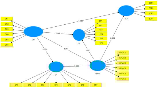 There are three indirect effects in this study: (1) GH → GPMC → ECP, (2) GH → GPMC → EP, and (3) GH → GPMC → SP. These suggested indirect relationships and their significance are represented in Table 7. The path coefficient value of GH → GPMC → ECP is 0.457, and the t statistics value is 3.522; more than a significant level (t > 1.96). Whereas the p-value is also significant. (0.000). The second indirect effect of the study is GH → GPMC → EP. The path coefficient value is 0.478, and similarly, the t statistics for this relationship is 3.698, more than the critical level (t > 1.96). Similarly, the third indirect effect path coefficient value is 0.429, and the p-value, t statistics are significant. Hence, mediating relationships in all three paths are considered significant.