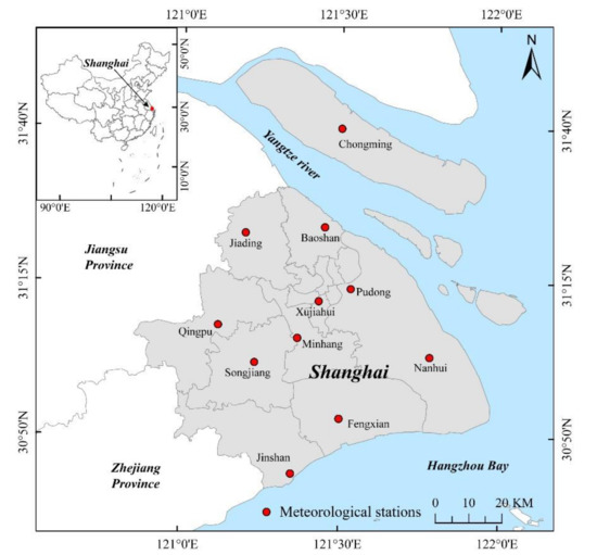 This study used the administrative territory of Shanghai (see Figure 1) as the study area. Shanghai is located on the west coast of the Pacific Ocean and the eastern edge of the Asian continent. The city is also situated in the confluence area of the Yangtze River and the Huangpu River as they flow into the East China Sea. The Yangtze River bounds shanghai to the north, the East China Sea to the east, Hangzhou Bay to the south, and Jiangsu and Zhejiang provinces to the west. The area’s climate is a subtropical monsoon climate with four distinct seasons, long hours of sunshine, and abundant precipitation. The study area covers 16 districts with a land area of 6340 km2 and is located between latitudes 30°40′ N and 31°53′ N, and longitudes 120°52′ E and 122°12′ E. Shanghai has been identified as one of China’s rapidly developing cities; it is an important economic, scientific, and comprehensive transportation center. In the process of rapid urbanization, the city is facing some environmental issues such as the urban heat island effect.