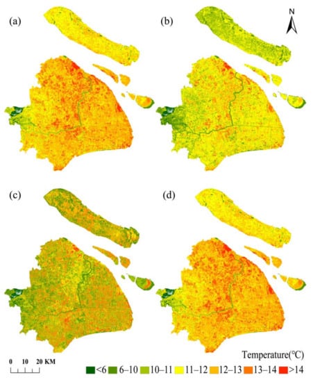 where Ts is the LST (K). T10 and T11 are the brightness temperature of band 10 and band 11. A0, A1, and A2 are algorithm coefficients (,,); A, E0, E1, and E2 are intermediate parameters determined by emissivity and atmospheric transmittance (,,,), where , , εi and τi are the LSE and the atmospheric transmittance of TIRS band 10 and 11, respectively. a10, b10, and a11, b11 are the empirical coefficients, which need to consider the location of the study area and the season of image acquisition. Since the winter land surface temperature range in Shanghai is between 0 and 30 °C, a10 = −59.1391, b10 = 0.4213 and a11 = −63.3921, b11 = 0.4565, and the summer temperature range is between 10 and 50 °C, a10 = −64.6081, b10 = 0.4399 and a11 = −69.0215, b11 = 0.4756.