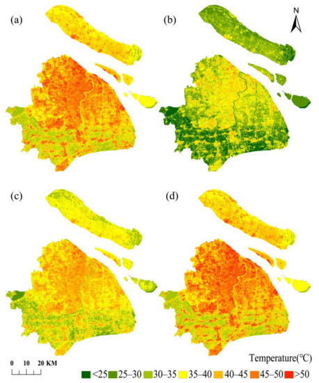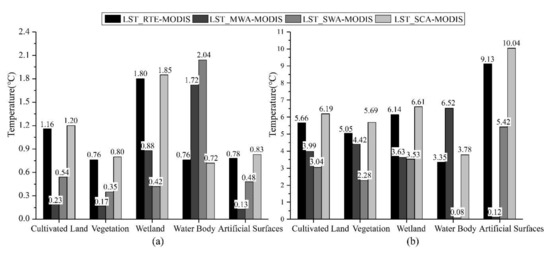 Therefore, this study can provide reasonable suggestions to select LST retrieval algorithms for different land cover types in different seasons in Shanghai. MWA is more suitable for the area of cultivated land, vegetation, and artificial surfaces in winter. Simultaneously, SWA should be selected in the wetland areas, while RTE and SCA are more suitable for the water body regions. In summer, SWA is more suitable for LST retrieval in cultivated, vegetated, and the water body areas; SWA or MWA should be chosen for the wetland, while SWA is more suitable for artificial surfaces.