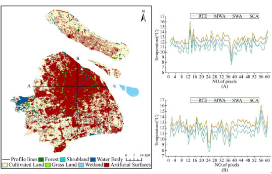 It is demonstrated that all four algorithms can better reflect the heat island effect in Shanghai by combining the spatial distribution of LST and the LST profiles. The temperature profile line dithering of SWA is more intense and has a higher amplitude compared to the other three algorithms, which can better reflect the differences in urban thermal environment changes due to different sub-bedding surface structures, and the difference between the artificial surfaces and other areas are larger in LST retrieval results. While RTE, MWA, and SCA’s temperature profile lines have roughly the same trend, RTE had better retrieval for the water body regions.
