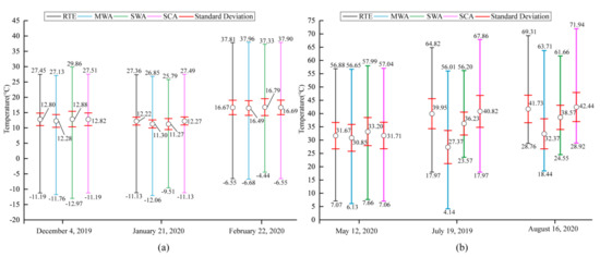 Based on the Landsat-8 images, the above Radiative Transfer Equation (RTE), Mono-Window Algorithm (MWA), Split-Window Algorithm (SWA), and Single-Window Algorithm (SCA) were used to retrieve LST. The differences between the four algorithms were explored by evaluating and comparing the retrieval results. Figure 5 shows the statistical plots of the four statistical indicators of minimum, maximum, standard deviation, and average values of the four algorithms’ retrieval results in winter and summer. Table 1 shows the differences (in absolute values) in the average LST values between the four algorithms, for any two algorithms. It can be seen that the overall trends of the surface temperature retrieval results of the four algorithms in different periods were relatively similar, but there were also some differences.