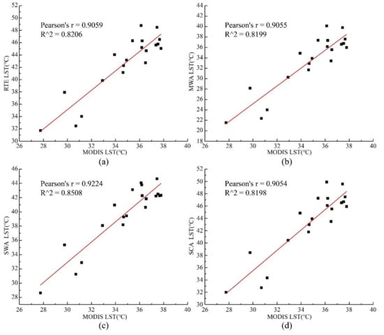This paper utilized the MOD11A2 surface temperature product to perform the cross-validation of four algorithms. The cross-validation is advantageous because no field temperature measurement is needed, and the MODIS temperature products are easy to obtain. The MOD11A2 temperature product is based on the SWA’s retrieval results with a temporal resolution of 8 days and a spatial resolution of 1 km. Landsat-8 thermal infrared data’s spatial resolution is 100 m, and the MODIS products need to be resampled to 100 m in order to be consistent with retrieval results for comparison. On a homogeneous surface, MODIS and Landsat are on the same scale, and the surface temperature within the pure image element should be the same for both. The MOD11A2 temperature product was analyzed for consistency with the surface temperatures of the four algorithms by selecting different sample points at the same latitude and longitude location in the study area, as shown in Figure 7. The RTE, MWA, SWA, and SCA have an excellent linear curve relationship with MODIS products from an general perspective, with correlation coefficients of 0.8256, 0.8199, 0.8508, and 0.8198, and Pearson coefficients of 0.9059, 0.9055, 0.9224, and 0.9054, respectively.