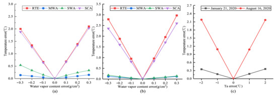 The errors in LST retrieval results due to changes in different parameters. (a,b) are the LST estimation errors resulting from the estimation errors in atmospheric water vapor content on 21 January 2020 and 16 August 2020, respectively. (c) is the LST estimation error of MWA due to the estimation error in effective atmosphere temperature.