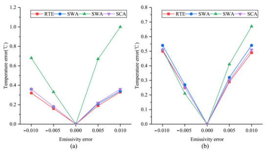 LSE is another critical parameter of LST retrieval. Previous studies have shown that the estimation error of LSE is usually less than or equal to 0.006 [37], and the LSE error can be expected to be within the range of ±0.01. Therefore, this study used the experimentally calculated LSE as the base for estimating the LST error for each algorithm. The results are shown in Figure 10, and it can be seen that the SWA’s sensitivity to the LSE was the highest among the four algorithms. When the LSE error increased by 0.005, the LST retrieval error reached 0.41 °C and 0.67 °C in winter and summer, respectively. The other three algorithms’ sensitivity to LSE was approximately the same, and for every 0.005 increase in LSE error, the retrieval error was about 0.30 °C in winter and 0.20 °C in summer.