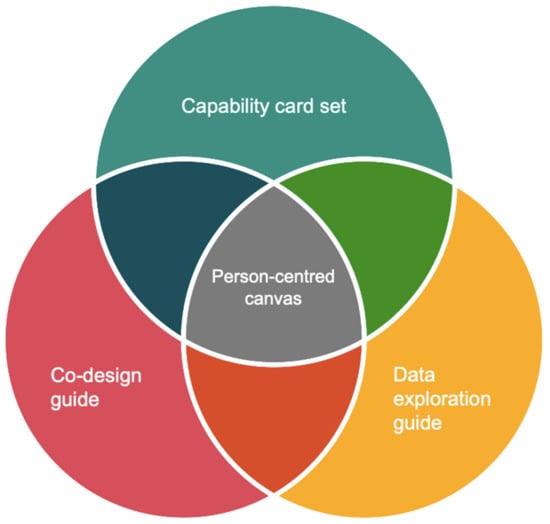 The relations between the four tools in the “Know-me” toolkit for personalising dementia care (i.e., Capability Card Set, Co-design Guide, Data Exploration Guide, Person-centred Canvas).