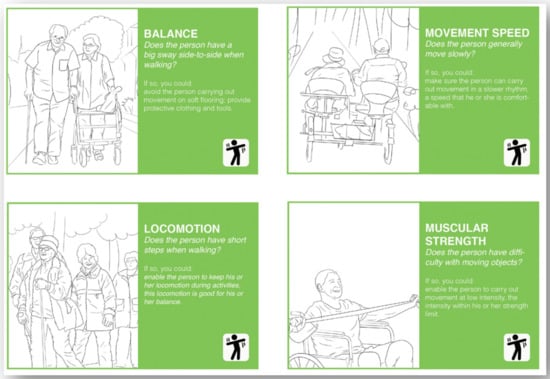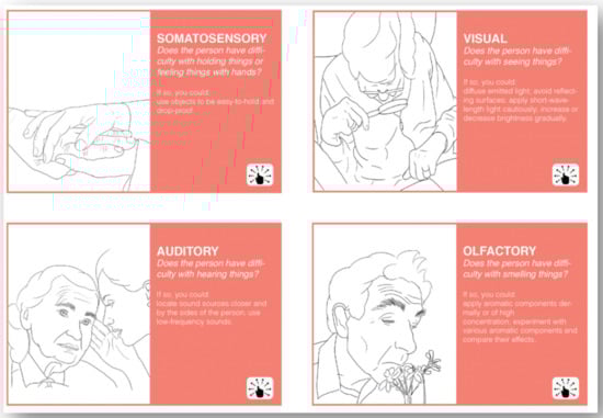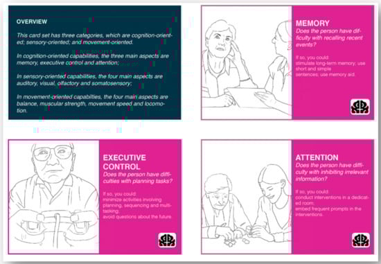 The overview instruction card and the cards for cognition-oriented capabilities can be found in Figure 2. The cards for sensory-oriented capabilities can be found in Figure 3. The cards for movement-oriented capabilities can be found in Figure 4. The full card set can be downloaded from the website www.designfordementia.squarespace.com (accessed on 20 May 2021).