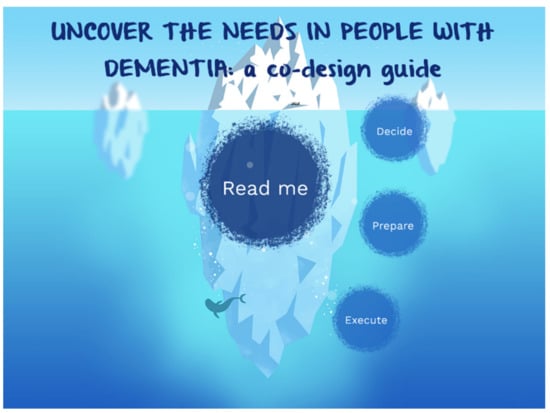The goal of this guide is to help users to uncover the needs of PwD. The co-design guide is created based on the exploration of the Co-design approach in designing for personalised dementia care. The first part of the exploration has been done using a scoping review [], the outcome of which has been evaluated in a field study []. The co-design guide is visualised digitally in a way that is easy to navigate (zoom-in, zoom-out). It is interactive with a layered design and provides an overview to make the information more digestible for the users. The home page of the co-design guide is shown in Figure 5.