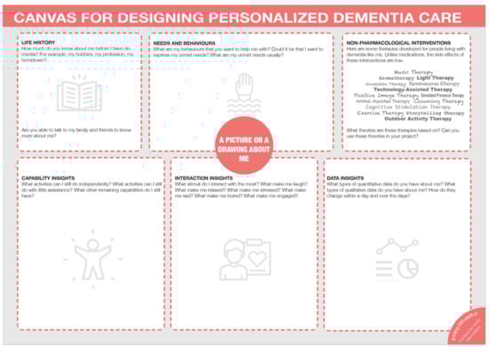 This canvas can be used in both a physical and digital format depending on the users’ preference. We recommend users write the information and insights on post-its (could be physical or digital) and then position the post-its in the appropriate sections of the canvas. The canvas offers a structure to organise post-its, and the post-its have the flexibility to be rearranged along the design process. The full-size canvas can be downloaded from the website www.designfordementia.squarespace.com (accessed on 20 May 2021).