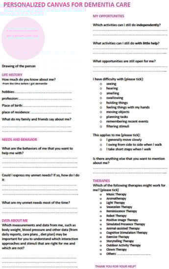 The aim of this canvas is to help the users to have a clear overview of which aspects need to be considered when designing for PwD. The person-centred canvas is developed from the Need-driven Dementia-compromised Behaviour model (NDB model) [], enriched by a systematic review on non-pharmacological interventions for dementia care [], and established after investigation of the three design approaches (i.e., Ergonomics in Aging, Co-design, Data-enabled Design) as mentioned before. A template of the canvas is shown in Figure 7.