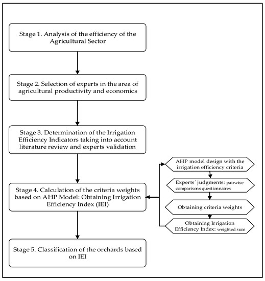 Several authors have introduced the use of AHP in the field of agricultural research. Alphonce [50] suggested the potential application of AHP in agricultural decision-making such as resource allocation, subsistence farming, or determination of the production technology. Other studies focus on the development of decision-making models; to select the most appropriate irrigation method [51,52], to select irrigation water optimal allocation [53,54], for the assessment of irrigation water quality [55], for the evaluation of agricultural water management [56], and in the improvement of irrigation projects [57]. However, no AHP studies have been found aimed at the construction of an integrative and comprehensive indicator of irrigation efficiency.