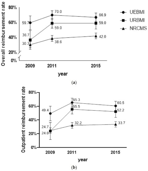 In response to the gap, the Chinese government has endeavored to narrow the breadth and depth of benefits variation across social health insurance schemes and seems to be making progress in this direction [42]. The government has invested substantially in expanding the coverage of social health insurance schemes to unemployed urban and rural residents. Meanwhile, increasing subsidies were provided by the government for the URBMI and NRCMS. They are mainly dependent on government subsidies [43]. In addition, to enlarge the scope of insurance, outpatient services have been included in the URBMI and NRCMS since 2011 [44,45]. Moreover, the level of reimbursement also improved, and the reimbursement rates of the URBMI and NRCMS set a target of 50% and 75% for outpatient and inpatient service by 2015 [22,23]. Thus, the gaps in the distribution of reimbursement rates and amounts across different social health insurance schemes have continued to narrow, as shown in our study.