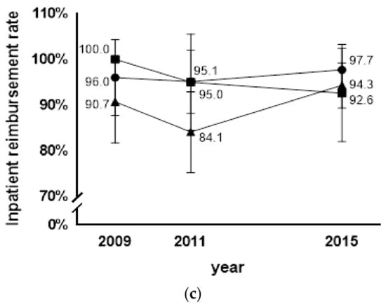 Figure 1. (a) Trend of overall reimbursement rate by year (with 95% confidence intervals) and social health insurance schemes in China; (b) Trend of outpatient reimbursement rate by year (with 95% confidence intervals) and social health insurance schemes in China; (c) Trend of inpatient reimbursement rate by year (with 95% confidence intervals) and social health insurance schemes in China.
