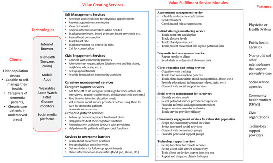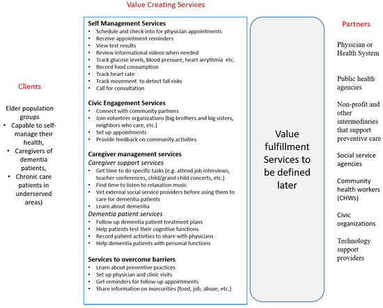 While this classification is not exhaustive, it does provide a range of services to older clients that span from self-health management to continual health monitoring in both supportive and less than supportive ecosystems [46]. Using these four different service types, Figure 1 below identifies a list of services needed to support these clients. As discussed earlier, the goal here is not to build a point-to-point solution that supports one group by one provider and its partners, but to develop a platform that is agile to address client needs as they evolve or change. The value fulfillment services that will become a part of a digital platform are discussed in the next section.