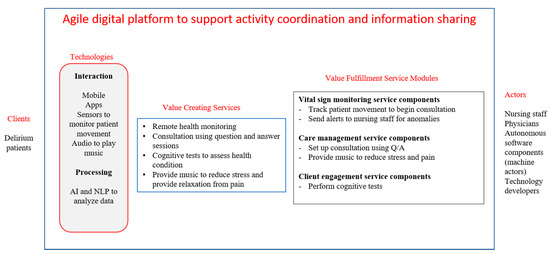 The discussion and the case study argue for an agile digital platform that not only brings together clients and clinical and non-clinical care providers, but also a mix of human and machine actors using a set of automated and autonomous digital services dynamically to create and fulfill value. Research on the actor-network theory [102] suggests that we often fail to distinguish between the efficacy of the network and the efficacy of the processes used in the formation of the network itself. We discussed the design of digital platforms to make a network agile, where clinical and non-clinical actors used value cycle activities and digital services to address the needs of the population groups. A future research question is, “How can the digital platform expand its agility to redefine the network itself?” For example, can the digital platform used to support delirium patients learn from the client questions their evolving intent, such as the need to reduce stress or help avoid isolation by adding new digital actors (e.g., a new digital service that autonomously delivers audio or video content to suit the client’s tastes in music) or new human actors (e.g., add an automated digital service that uses teleconsultation with a mental health counselor or a social media interaction with others to exchange stories or play games)? Both of these call for altering the process used to create the network, which in turn is used to create value.