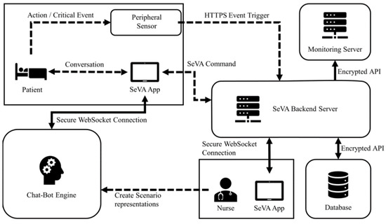 - A patient begins the scenario with an event, for example “waving hand.” When this patient request is received, the peripheral sensor recognizes the action and sends an hypertext transfer protocol secure (HTTPS) request to the SeVA backend server;