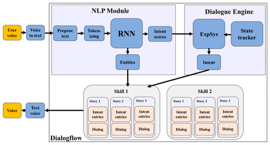The chatbot engine transforms the user’s voice into plain text, which is processed by the natural language processing (NLP) module. Using discrete word pre-processing and tokenizing, it is sent to a recurrent neural network (RNN) module. The output of the RNN is matching the word candidates if the patient poses a directly interpretable request or a suggested intent score of the patient’s question. If it is an intent score that needs further interpretation, it is then sent to the dialogue engine of the expert system module to decide on the final interpretation of the patient request. See Figure 5.