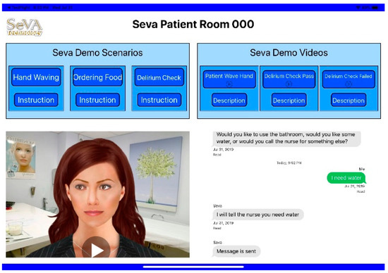 For delirium checks, the SPR starts by checking the patient’s delirium status by asking questions, or launches the delirium check game and uses cognitive assessment tests [92]. Two delirium check games are used at present. The first game, “Connect Node”, is used for testing visuospatial and executive ability. The patient is required to connect the node in a given order. If a patient fails the test, a message will be immediately sent to the SMC. The second game, “Click Animal”, tests patient attention. Pictures are displayed and disappear. The patient has to click the animal picture. The checking result will also be sent to the SeVA Master Control application. For supporting relaxation services, the SPR has embedded music created by the therapist in order to create a calm atmosphere and relieve panic.