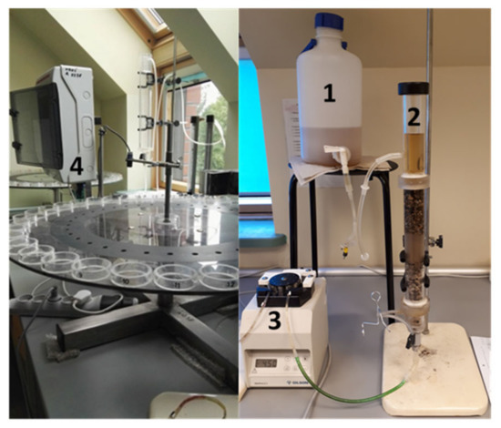 The system for soil flushing (under dynamic conditions) consisted of a column reactor, a container for flushing solution, a peristaltic pump, an automatic sample collector, and an automatic device for collecting samples (Figure 2).