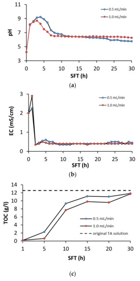 Effect of soil flushing time (SFT) on (a) pH, (b) EC and (c) dissolved TOC in TA leachate from the column reactor.