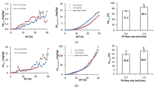 Metal removal, cumulative metal removal (in mg/kg), and metal removal efficiency (in %) from soil as a function of soil flushing time (SFT) and TA flow rate: (a) Cd, (b) Cu, (c) Ni, (d) Pb, and (e) Zn. For metal removal efficiency, different letters indicate significant differences in metal removal between the two flow rates (ANOVA followed by Tukey’s honest significant difference test, p < 0.05).