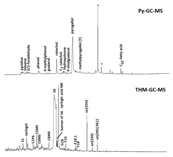 In addition, polysaccharide products (furans and furaldehydes), N-containing pyrolysis products from proteins (indoles, diketopiperazines), and other phenols (phenol and methylphenols) can originate from plant and microbial sources (e.g., [59]). After soil flushing, the pyrolysate was radically different, evidenced by a dominance of catechols and pyrogallols, clearly indicating the retention of TA by the soil and perhaps its incorporation into the soil organic matter. Indeed, these compounds are known as the main products of TA and of other tannins with a trihydroxybenzene configuration [60], including the TA used here and analyzed separately. The soil samples after flushing did not produce a peak that could be allocated to the carbohydrate nucleus of TA but neither did the untreated pure TA sample, which may indicate a high degree of galloylation or chromatographic bias. Potential differences in TA’s molecular features with and without interaction with the soil cannot be addressed reliably due to the completely different matrix composition of the samples (80% minerals in soil after flushing, 0% in pure TA), and even despite the HF treatment, this has major effects on reaction dynamics and due to the large (flattened) and broad peaks of, especially, the pyrogallol moieties. By THM-GC-MS, similar observations can be made, but the TA derivatives are now recognized as di- and trimethoxybenzenes, in particular 3,4,5-trimethoxybenzoic acid methyl ester (methylation product of gallic acid; [33]). The lignin present in the organic matter of the soil sample (before or after flushing) was characterized by the methylation products of p-coumaric and ferulic (or caffeic) acids (P18 and G18), showing that it was indeed largely grass-derived and in a good preservation state. Fatty acid methyl esters (FAMEs), including methoxy-substituted FAMEs, could be detected as well. Their chain length distribution suggests that they originated from plant materials.