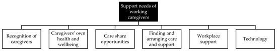 The aim of this study was to explore the support needs of working informal caregivers taking care of an older adult. The needs of the caregivers could be clustered around the following six themes: (1) Recognition of caregivers, including the challenges they face; (2) Attention for caregivers’ health, wellbeing and ability to cope; (3) Opportunities to share care responsibilities; (4) Help with finding and arranging care and support; (5) Understanding and support from the work environment; (6) Technological support tailored to the needs and capacities of caregivers and older adults. The results show that caregivers need support to balance caregiving with other aspects in their lives, including paid work, home life and their personal health and wellbeing. Support is needed across multiple settings and domains of life (i.e., home and social environment, care and support environment, workplace and societal/policy environment (see also Table 3), and should be tailored to the caregivers’ and care recipients’ contexts. This implies involvement of several actors in the provision of support (e.g., health and social care professionals, actors within the work environment, local policy officers etc.), including the caregivers themselves.
