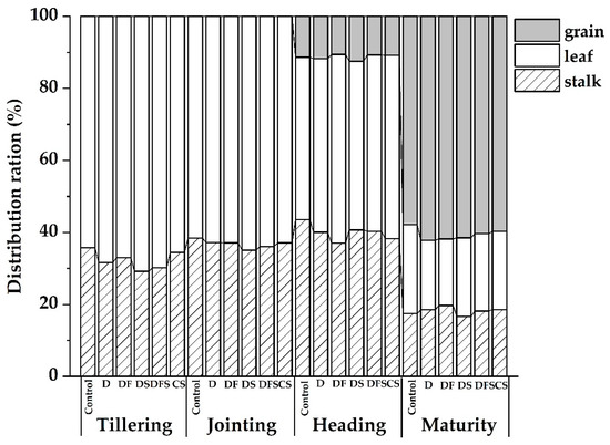 In all treatments, N distribution in the stalk significantly increased from tillering to heading and decreased from heading to maturity, with translocation to grain occurring (Figure 1). At tillering stage, compared to the CS and Control, the digestate can promote the N distribution to leaf. At jointing stage, the trend of N distribution to leaf was the same as that at tillering stage, with DS being the highest and the control being the lowest, but the difference was not significant. The highest N distribution in leaf was found in DS both at tillering and jointing stages. At heading stage, N distribution to leaf was DF > CS > DFS > D > DS > Control; the highest value was 52.40% under DF, and the lowest was 45.08% under Control (Figure 1), with a significant difference, while the other four treatments had no significant difference. At maturity, N distribution to grain was in the decreasing order of D > DF > DS > DFS > CS > Control; the highest value was 62.18% under D, and the lowest was 57.87% under Control (Figure 1).