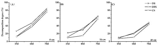 Figure 2. Dynamics of straw decomposition rate over time at 0 cm (A), 10 cm (B) and 20 cm (C) soil depths under DS, DFS and CS.