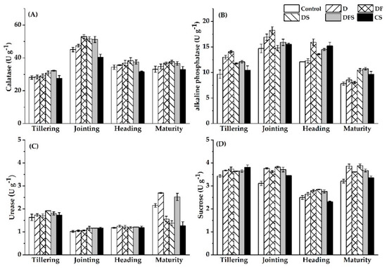 Soil alkaline phosphatase can catalyze the mineralization and hydrolysis of soil organic phosphorus and can help the plants to absorb phosphorous. During the tillering and jointing periods, alkaline phosphatase activity was significantly decreased in DS compared to D and in DFS compared to DF. At maturity, alkaline phosphatase activity in DS and DFS increased by 22.39% and 33.50%, respectively (Table 3). This indicates that the coupling of straw with digestate restrained the effect of alkaline phosphatase at the early growth stage but would contribute to the improvement of alkaline phosphatase activity at maturity.