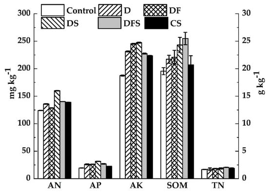TreatmentsSOM (g mg−1)TN (g mg−1)AN (mg kg−1)AP (mg kg−1)AK (mg kg−1)