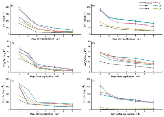 Figure 5. The TN (A,B), NO3-N (C,D) and NH4+-N (E,F) concentrations in soil surface water during the 7 days after digestate was applied as base (A,C,E) and panicle (B,D,F) fertilizer. The error bars represent means ± 1 SE.