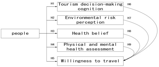 Furthermore, the main purpose of tourism activities is to provide participants with a situation and behavior that improves their physical and mental health [28]. However, under the threat of an epidemic-infected environment, people’s participation in tourism behavior will constitute a risk [6]. For the public, the risk of travel is the risk of physical and mental health [33], which is contrary to the purpose of travel. Failure to protect physical and mental health will affect the willingness to participate in travel [34] and further affect travel intentions and behaviors [35]. Therefore, it is believed that conducting personal physical and mental health assessments can anticipate tourists’ willingness to participate in upcoming tourism activities and people’s confidence in travel policies.
