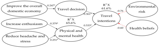 However, even if the policy is perfect, the environmental risks of tourism still exist. The rapid scientific progress after the industrial revolution has led to the emission of large amounts of waste, resulting in an abnormal climate and more disasters, such as heatwaves, rainstorms, high temperatures, extreme cold, haze, and a proliferation of infectious diseases [24]. In addition, the unresolved COVID-19 epidemic can be transmitted by droplets and contact with infectious agents, and by other unknown routes of infection such as asymptomatic individuals, and the lethality rate is quite high [17,18,25]. Tourism activities make use of the natural landscape as well as the ecological and human–social resources to improve the physical and mental health of the participants through human planning [26]. However, the current epidemic is still unclear, and the side effects and uncertainties arising from the external risks of travel, man-made hazards, and factors such as the epidemic and climate change will increase the risk of travel and affect people’s willingness to travel [27]. Therefore, this study assumed that the awareness of environmental risks in travel can be used to estimate people’s willingness to travel.