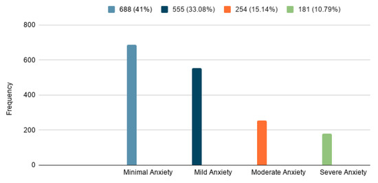 As demonstrated in Table 2, out of 1678 respondents, 1200 (71.5 %) were frontline healthcare workers, while 478 (28.5%) were second-line healthcare workers. Of the total frontline and second-line healthcare workers, 435 (25.92%) had moderate to severe anxiety. There were 713 (59.4%) frontline healthcare workers suffering from anxiety overall, compared to 277 (57.9%) second-line healthcare workers. The results further indicate that there were 137 (11.41%) frontline healthcare workers suffering from severe anxiety, compared to 44 (9.20%) second-line healthcare workers. It has also been identified that moderate to severe anxiety was higher in physicians and nurses (184 (15.33%)) compared to consultants (66 (5.55%)) (Table 2, Figure 2).