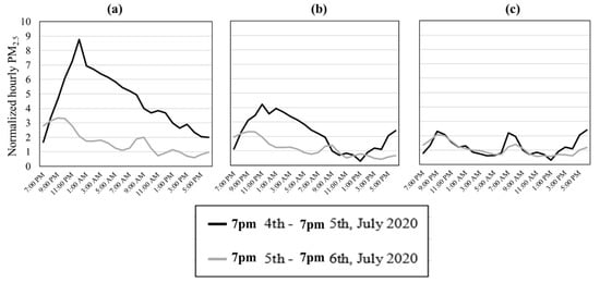 The hourly average, daily average, and weekly average PM2.5 concentrations were computed by averaging 10 min data using a 75% completeness criterion (≥4 10-minute measures per hour and ≥18 h in a day). These data were grouped by census tract and county in order to investigate the local and regional impacts. July 4th-related firework activity usually takes place gradually, beginning in the first few days of July and peaking on the 4th and 5th of July []. To quantify the short-term impact of firework emissions, normalized hourly average PM2.5 concentrations were investigated at the county level in 2019 and 2020 over three 24 h time periods before (7:00 p.m. July 3rd–6:59 p.m., July 4th), during (7:00 p.m. July 4th–6:59 p.m. July 5th), and after (7:00 p.m. July 5th–6:59 p.m. July 6th) the main 4th of July firework displays.