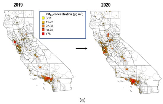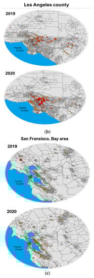 The PurpleAir monitoring network consists of low-cost air pollution monitoring devices that started to be deployed in the U.S. and worldwide in 2017. The latest model (PA-II-SD) contains two PMS5003 sensors (Plantower, Beijing, China), which estimate particle mass concentrations based on light scattering []. Overall, PurpleAir PA-II sensors show excellent accuracy compared to reference PM2.5 measurements (i.e., R2 ~ 0.93–0.97) over a concentration range of 0 to 250 µg·m−3 []. Further details regarding the lab evaluation of PurpleAir sensors conducted by the South Coast Air Quality Management District (AQ-SPEC team) and other research groups can be found elsewhere [,]. Recent studies have suggested the use of the PurpleAir network to supplement regulatory monitors for PM2.5 exposure assessment []. In this study, 10 min PM2.5 concentration data during June and July in 2019 and 2020 were retrieved from the PurpleAir network using ThingSpeak’s API provided by the PurpleAir company []. A continued expansion of the PurpleAir network in California has resulted in an increase in the number of operating sensors from 231 in July 2017 to 751 in July 2019, and a further increase to 2095 in July 2020. In order to allow for a comparison between the years, this study only retrieved PM2.5 raw data from the individual outdoor devices that were in operation in both 2019 and 2020, amounting to 751 PurpleAir devices across the state. These sensors were primarily located in densely populated areas (Figure S1).