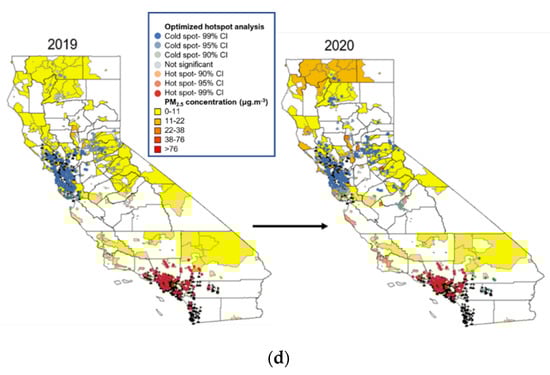 Optimized hot spot analysis, a tool that identifies statistically significant spatial clusters of high values (hot spots) and low values (cold spots), was performed on the average daily PM2.5 concentrations on the 4th and 5th of July 2019 and 2020 using ArcGIS software (ESRI, Redland, CA, USA) and the Getis-Ord Gi* statistic [,]. Regular 4th of July firework festival/celebration locations reported by local authorities across California were also retrieved from patch.com, a local news and information platform, which serves as an announcement portal and gathers 4th of July firework news such as Google map locations, firework start times and durations, as well as potential restrictions on firework sales (e.g., age limitations and discrete sales periods) were announced across each county and across different cities. Their corresponding location coordinates were overlaid with hotspot results and projected onto a map using ArcGIS to evaluate the proximity of PM2.5 hotspots relative to municipally operated firework displays.