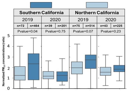 In California, while regulations vary by city and county, only non-aerial fireworks are allowed for personal use []. Legal consumer fireworks are also subjected to strict regulations on the selling period and purchasing age limit of such items []. While several highly populated counties (n = 15) (Table S1), such as San Diego, Contra Costa, and San Francisco, are on the list of counties where municipal firework shows are illegal [,], more than 80% of the counties on this list were located in northern California. Although a county may choose to legalize fireworks, in some cases cities within those counties still prohibit them []. For example, less than half and one-third of the cities in Los Angeles County and Orange County, respectively, allow fireworks despite them being legal at the county level. Overall, the percentage of cities with legalized fireworks was lower in northern California (~14%) compared to southern California (~29%). The lack of effective regulations in 2020, given the COVID-19 lockdown and increase in household fireworks, likely caused the observed differences between the 2019 and 2020 PM2.5 levels. These results underscore the importance of not only county-wide regulations but also city- and/or community-wide regulations to reduce short-term firework-related PM2.5 exposure.