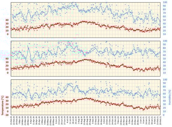 Daily maximum temperature and average humidity for Tokyo (top), Aichi (Nagoya) (middle), and Osaka (bottom) from 15 February 2020 to 20 February 2021. Lines represent a 7-day average.