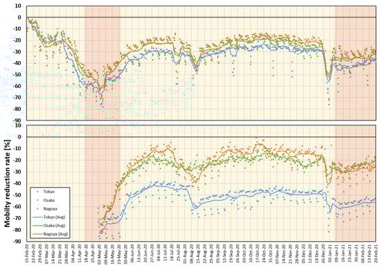 Mobility reduction rate according to the Google mobility report (top) and DoCoMo mobile usage (bottom) in Tokyo, Aichi (Nagoya main station), and Osaka. Red regions demonstrate the time for Japan’s national state of emergency. Lines represent a 7-day average.
